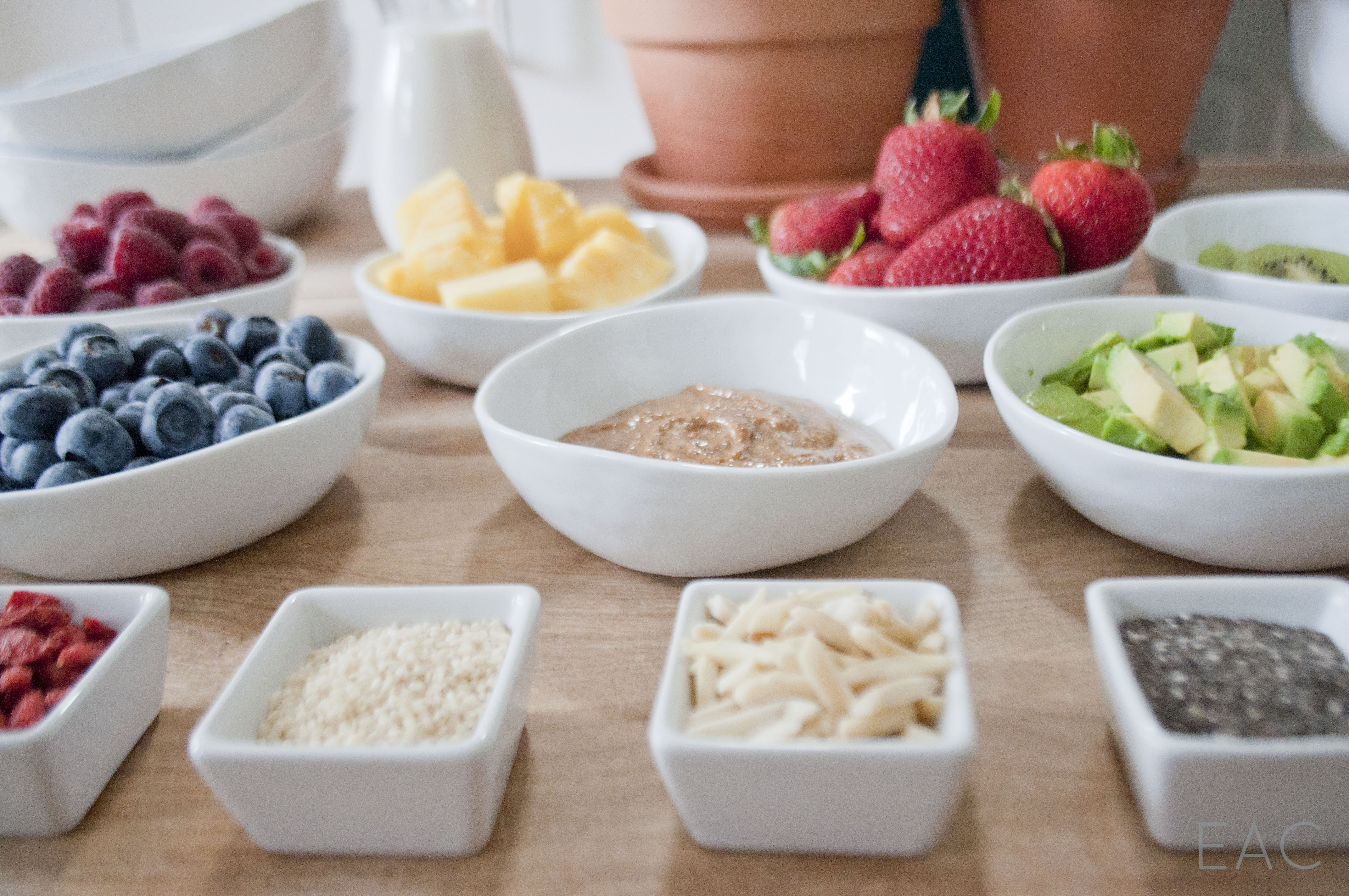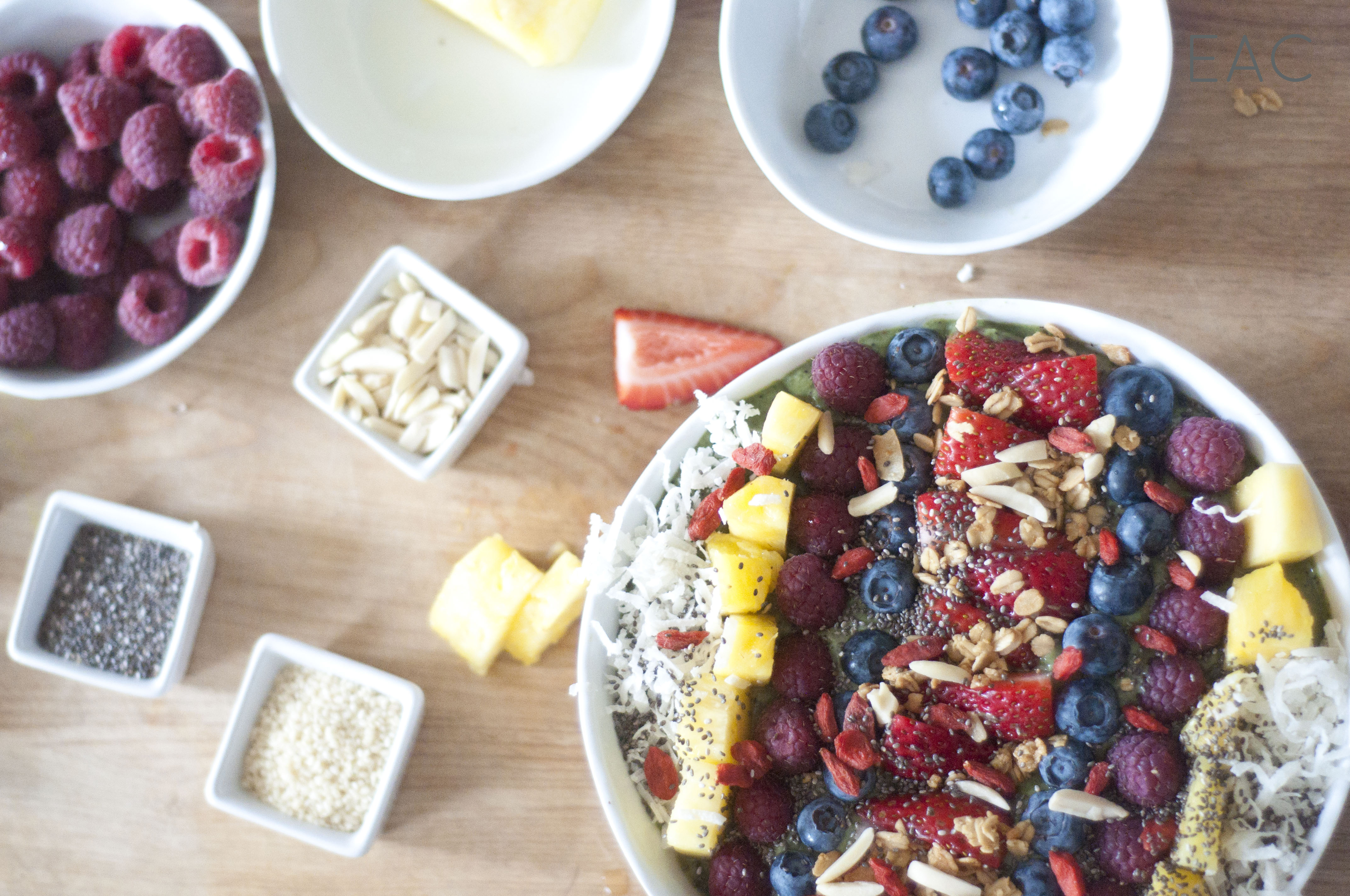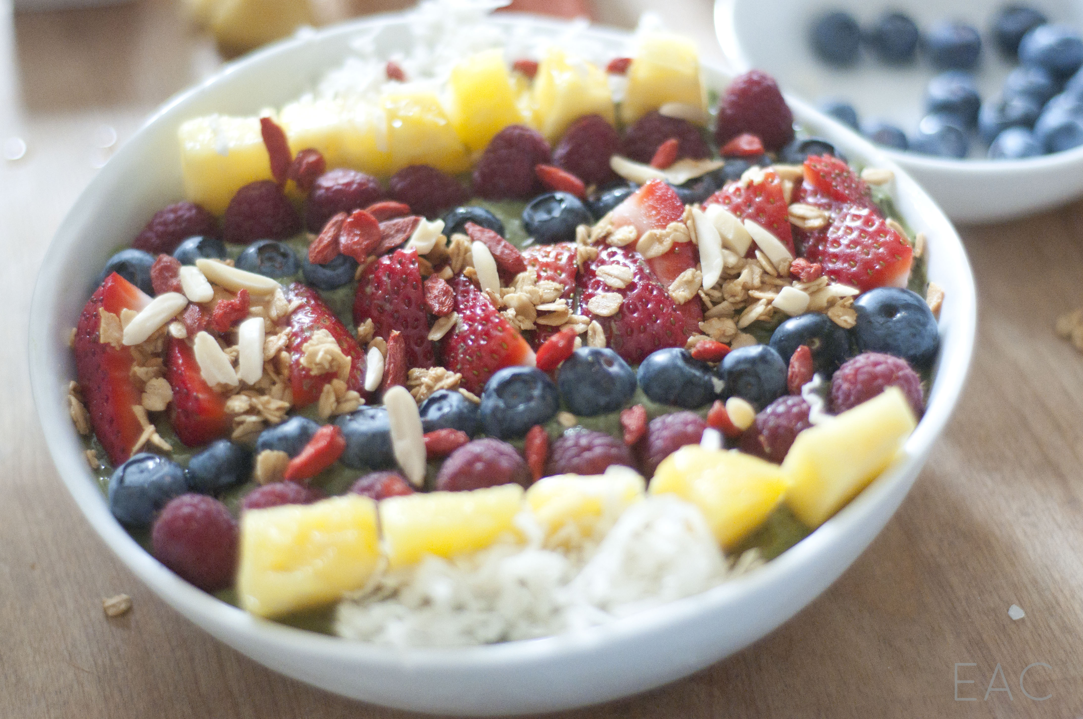 Our toppings: Strawberries Blueberries Raspberries Pineapple Goji berries Sliced almonds Chia seeds Granola Coconut flakes Some other topping options: Kiwi Sesame seeds Almond butter or natural peanut butter Flaxseed Pepitas Raisins Cocoa nibs Banana