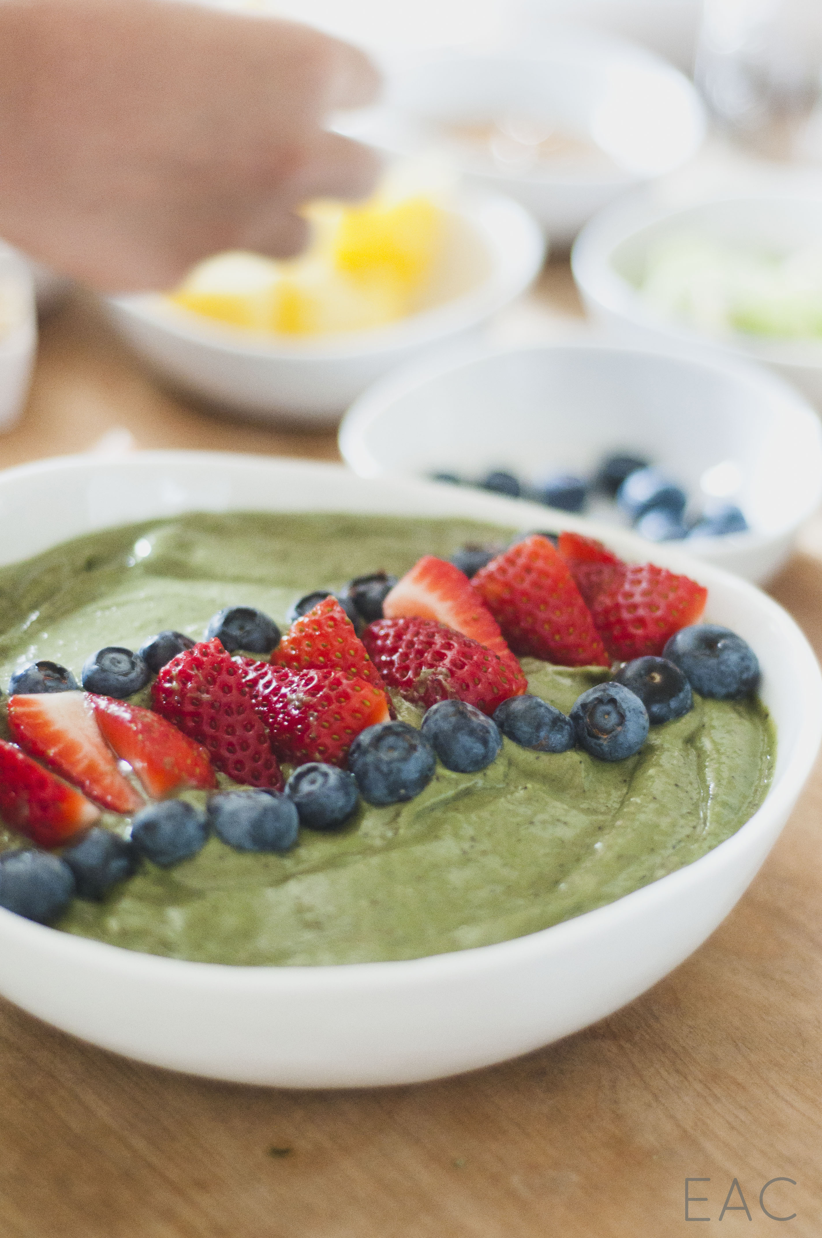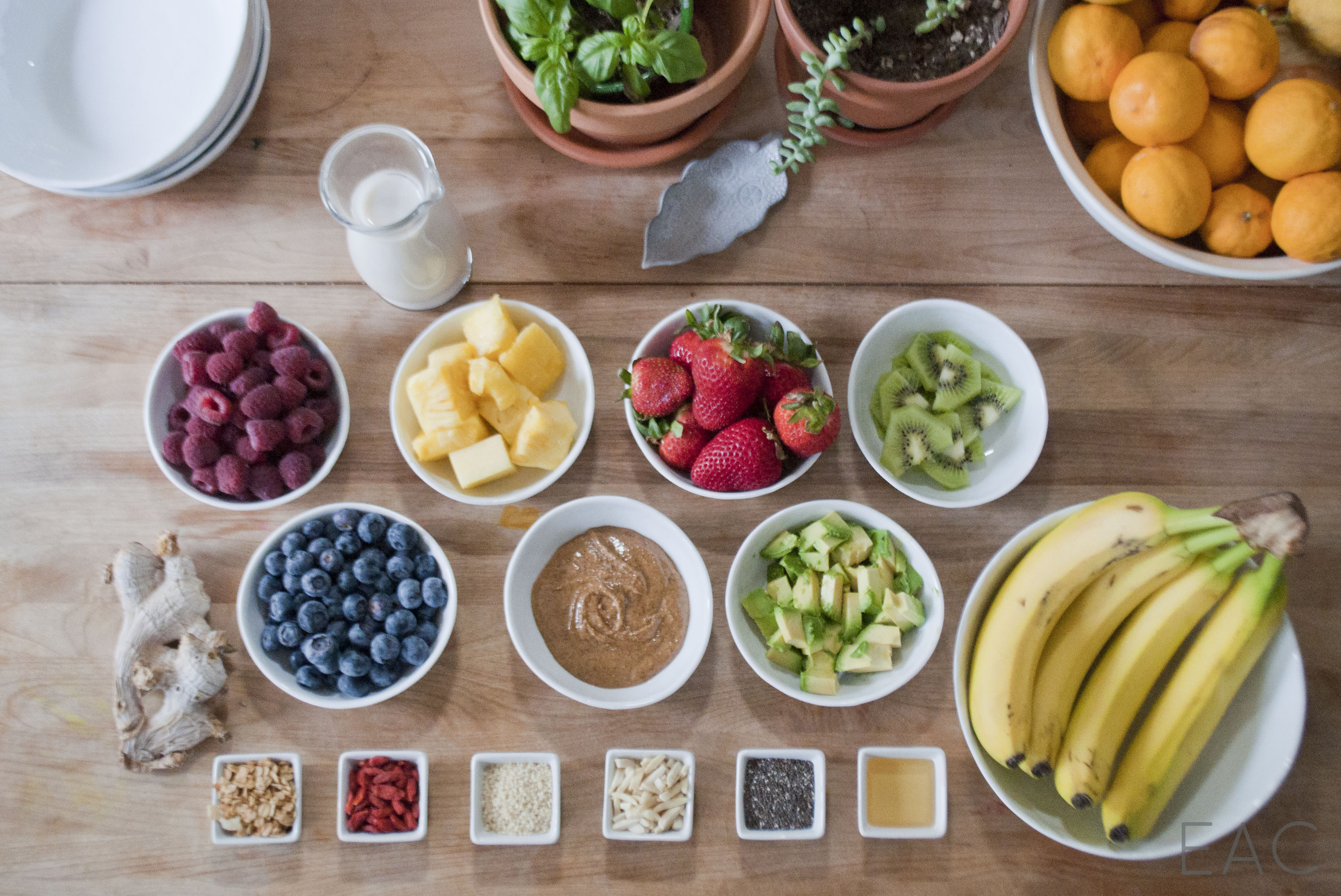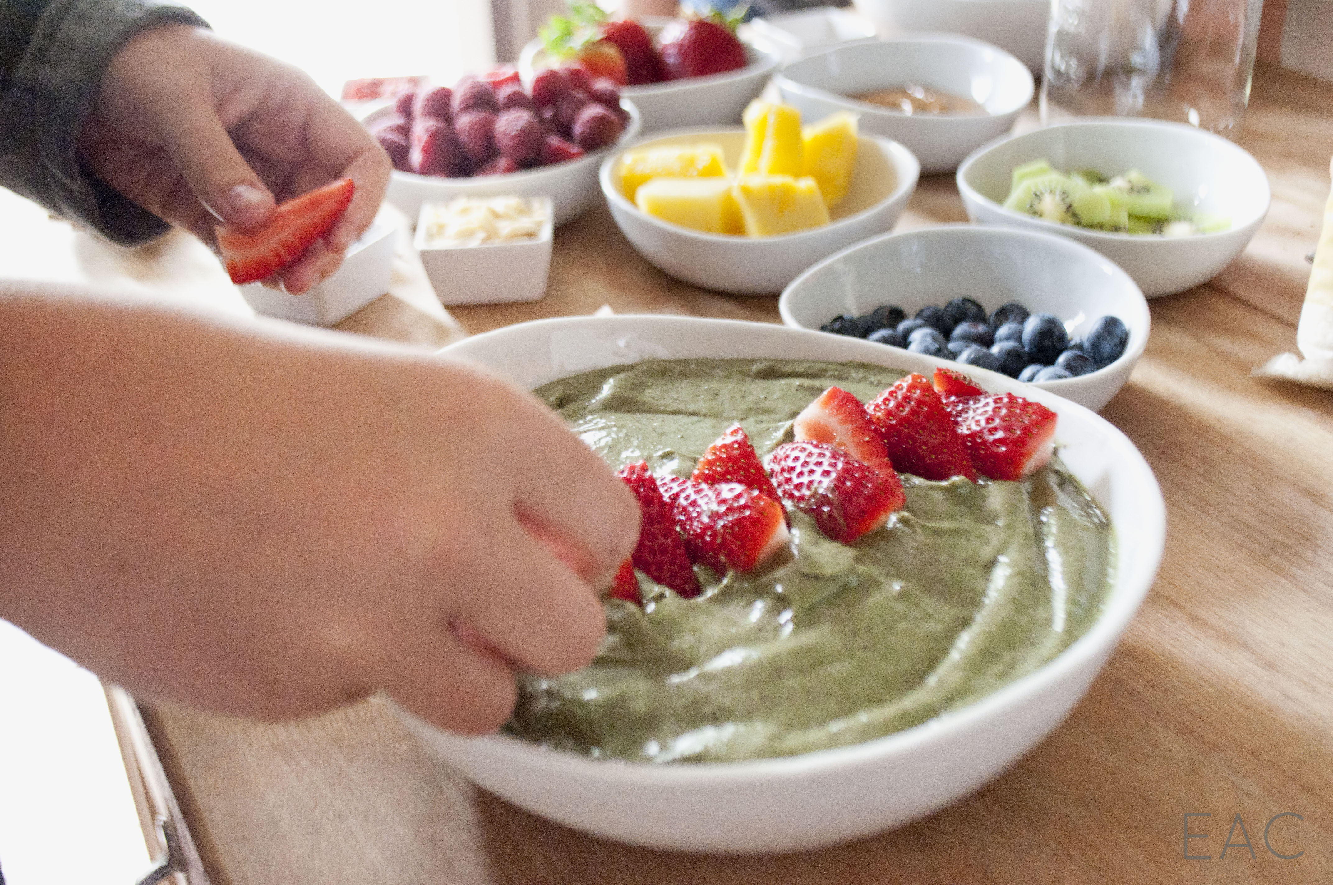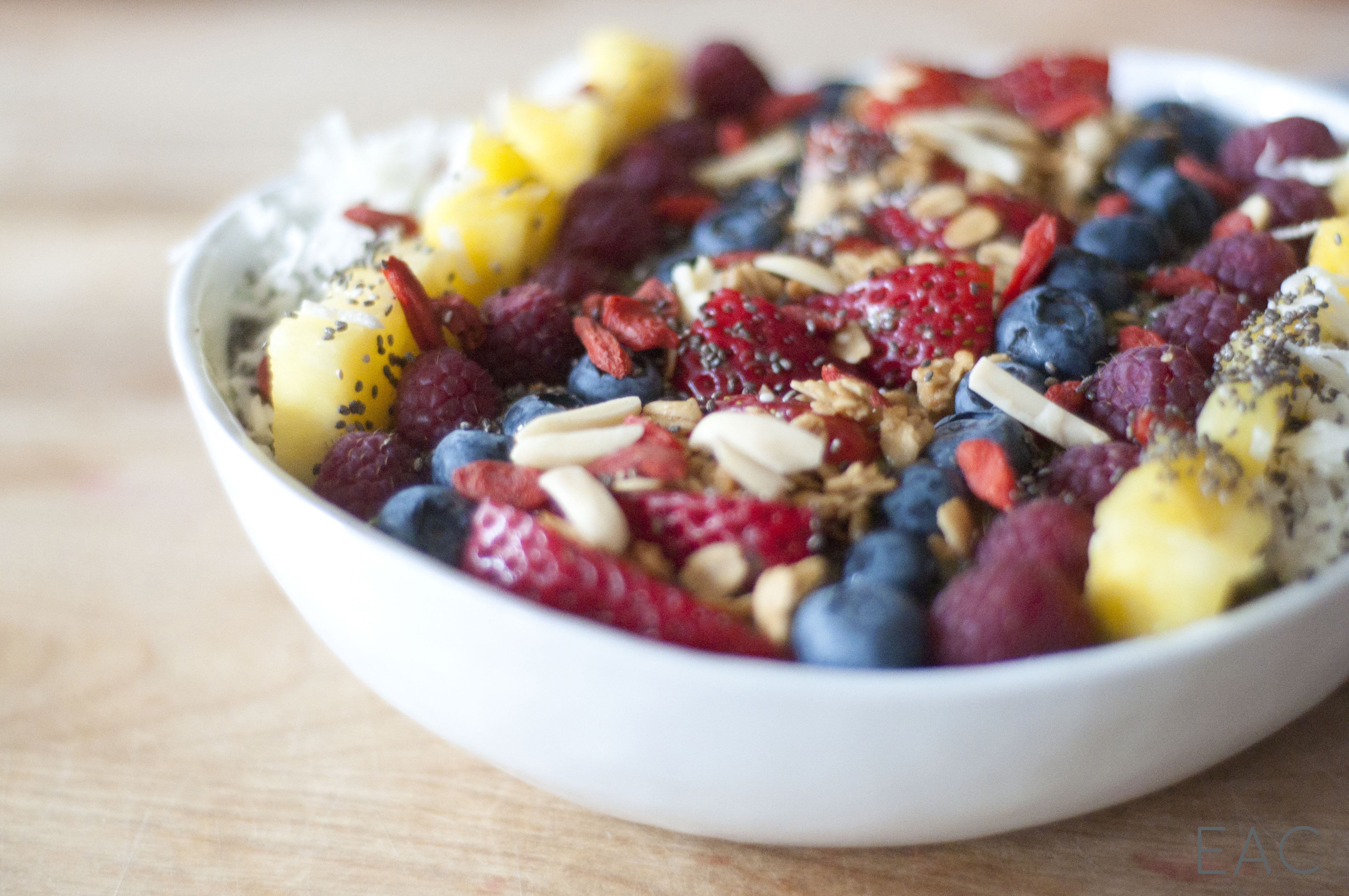 Our toppings: Strawberries Blueberries Raspberries Pineapple Goji berries Sliced almonds Chia seeds Granola Coconut flakes Some other topping options: Kiwi Sesame seeds Almond butter or natural peanut butter Flaxseed Pepitas Raisins Cocoa nibs Banana