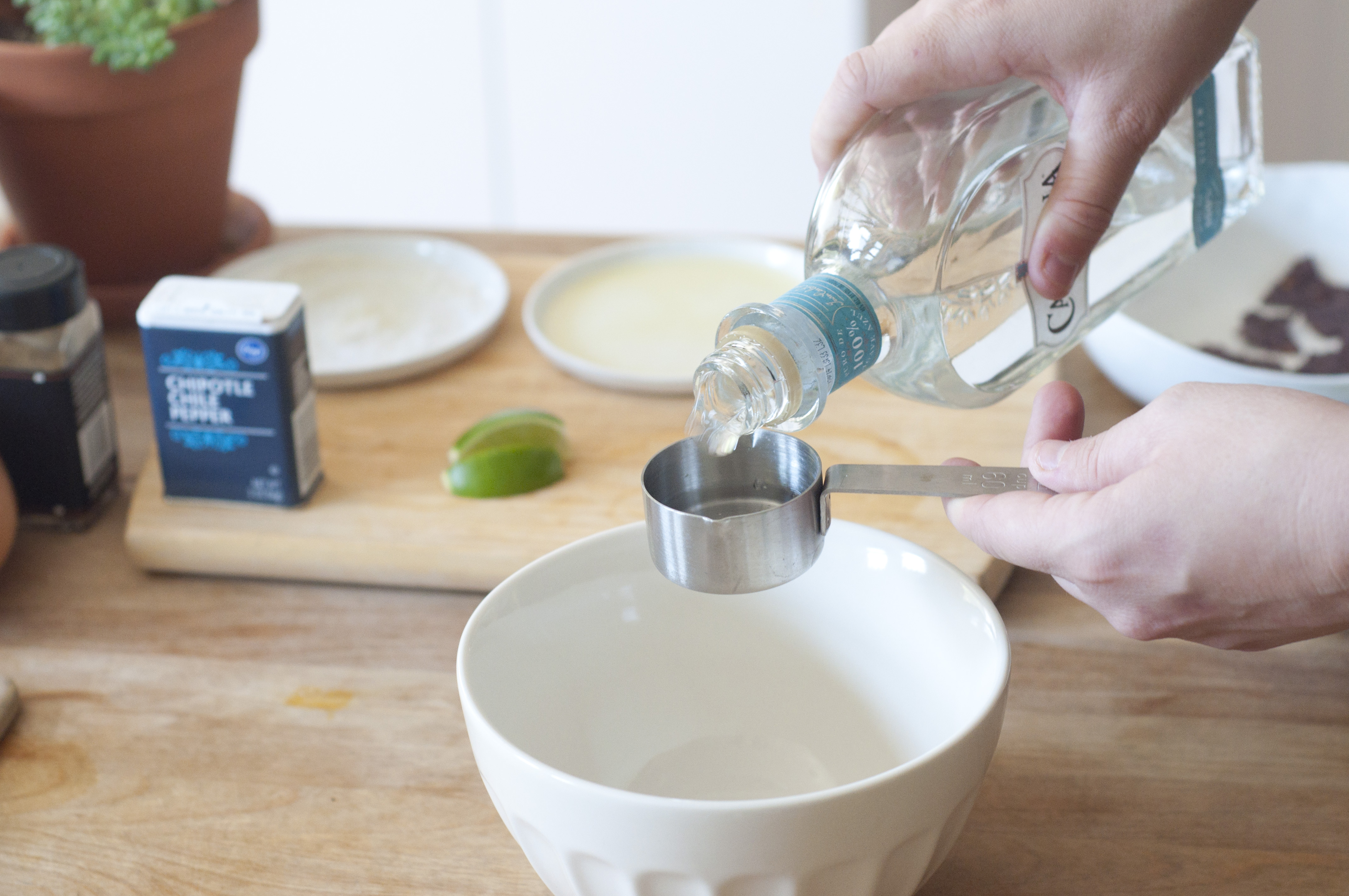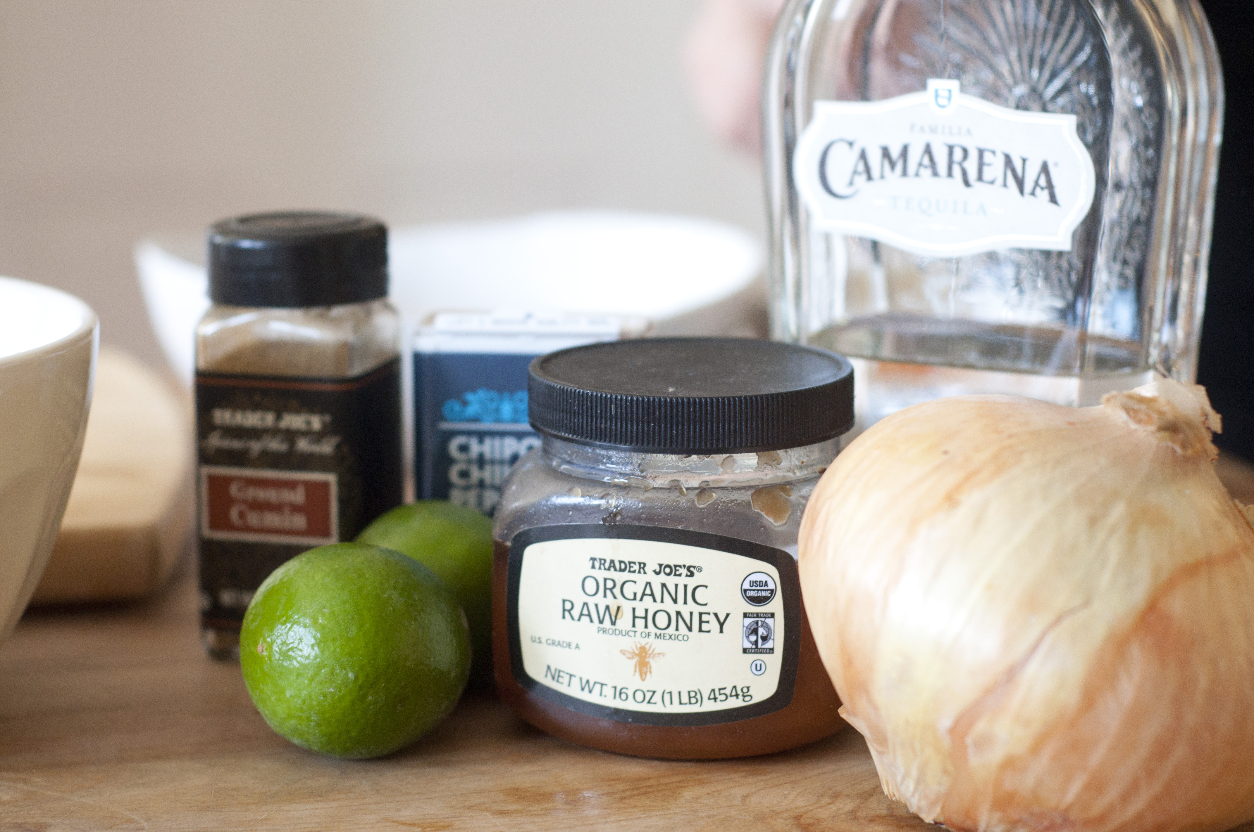 2. In a bowl, mix honey, lime juice, tequila, cumin, chipotle chili powder, and onion to make the marinade.