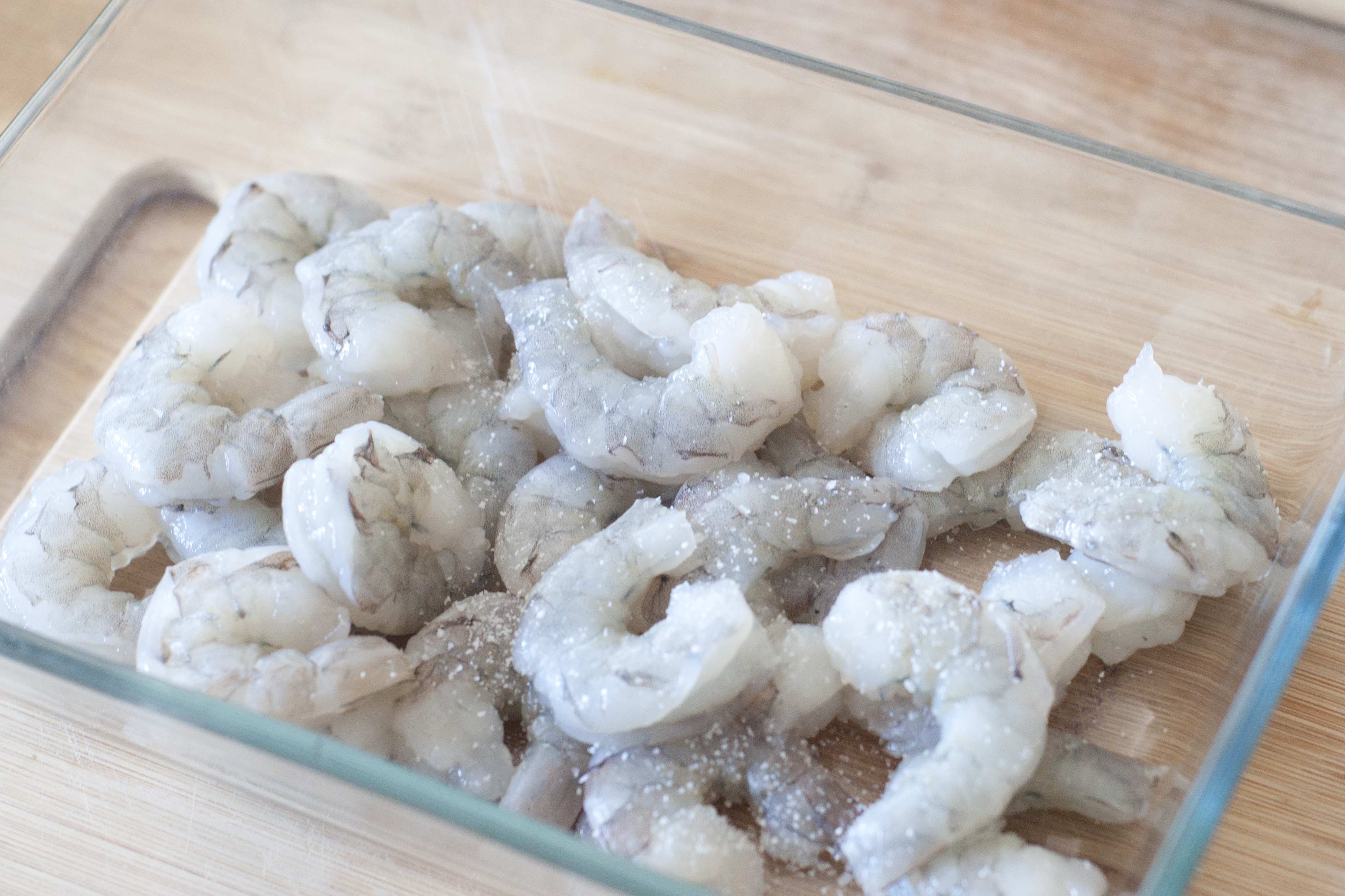 1. Peel, rinse, and dry shrimp. Place on a plate and season with sea salt.