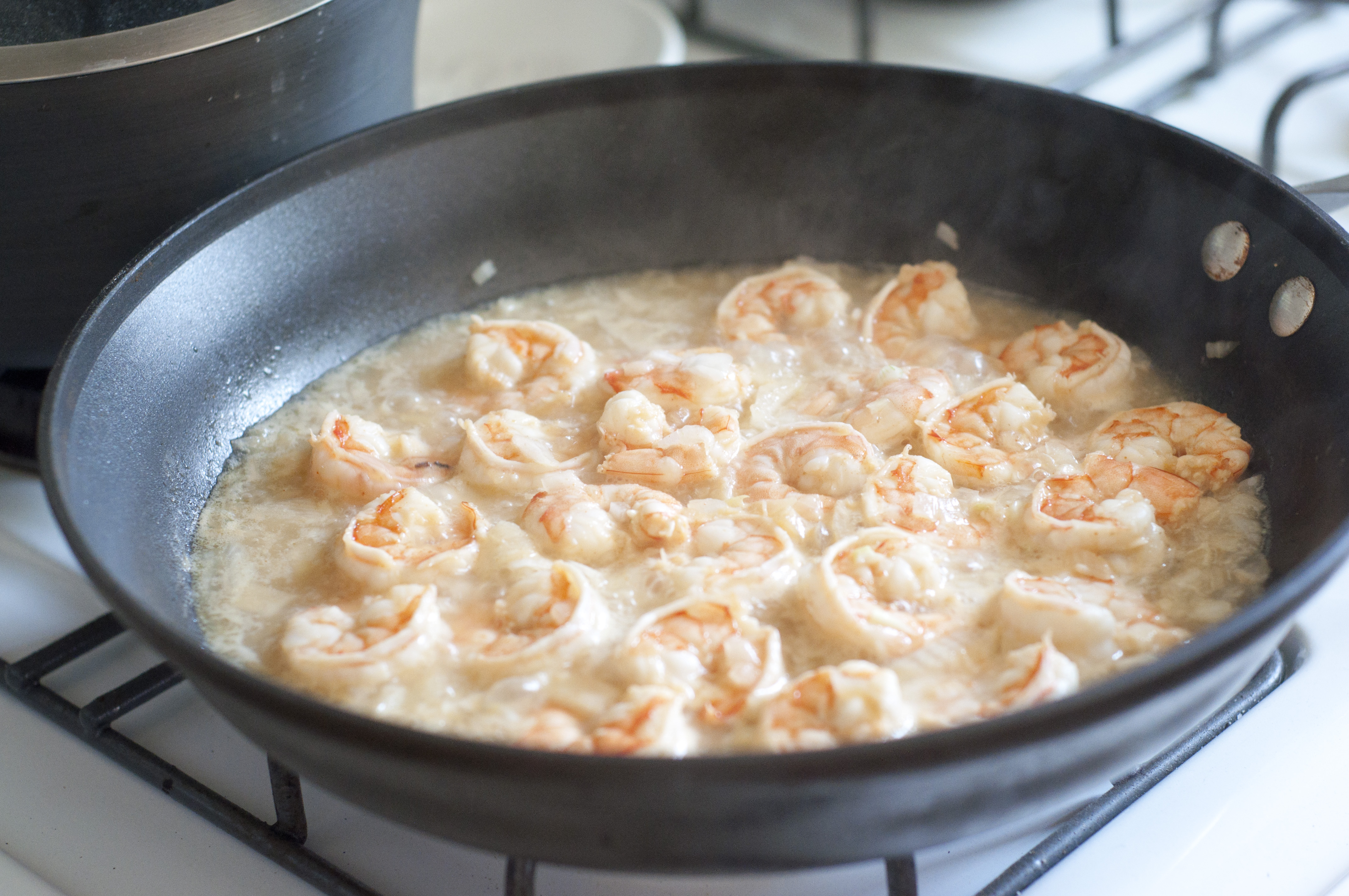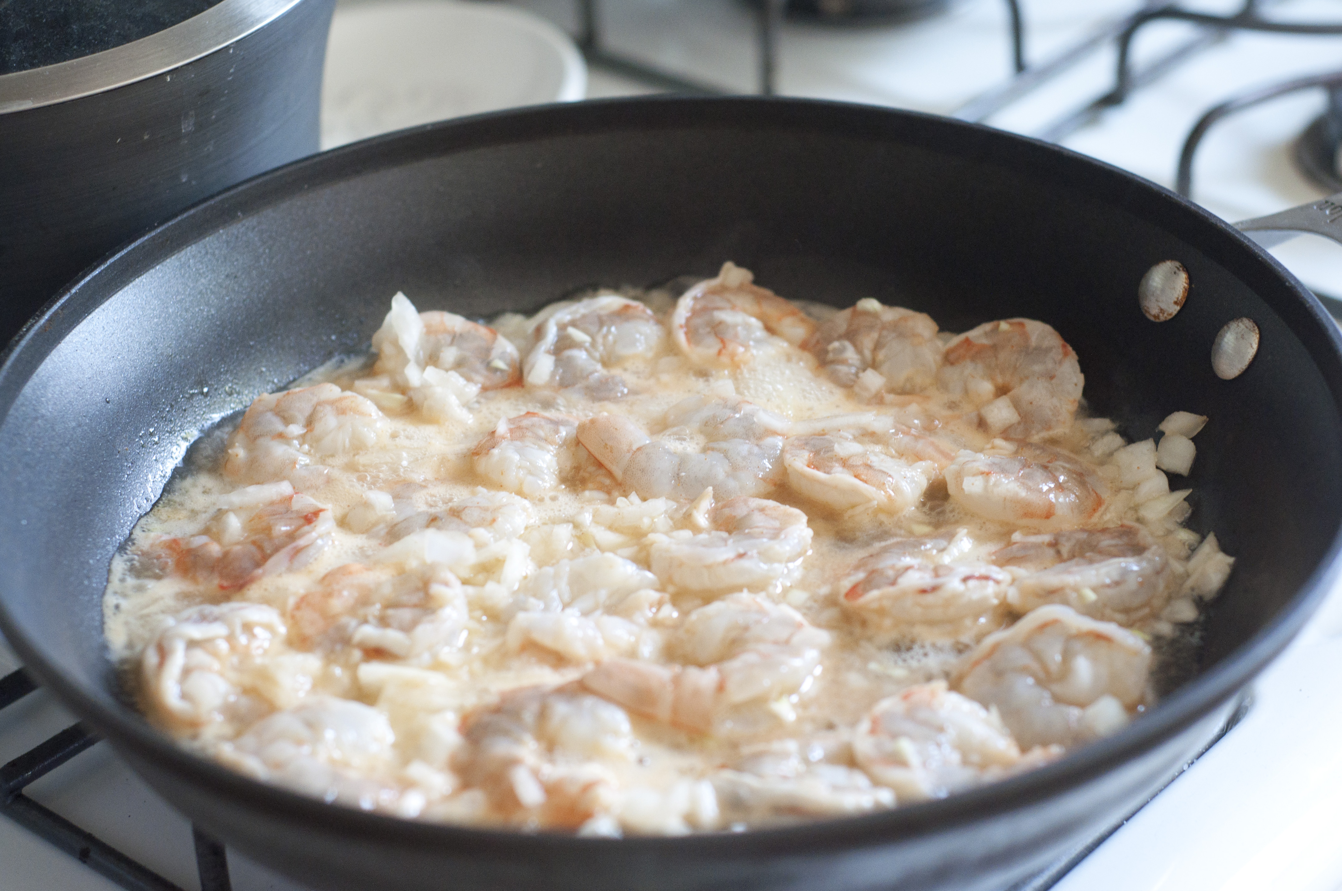 8. In a large pan, drizzle 2 teaspoons of olive oil and heat over medium high heat. Add shrimp and 2/3 of the marinade and cook for about 5-8 minutes (until they are opaque and orange).