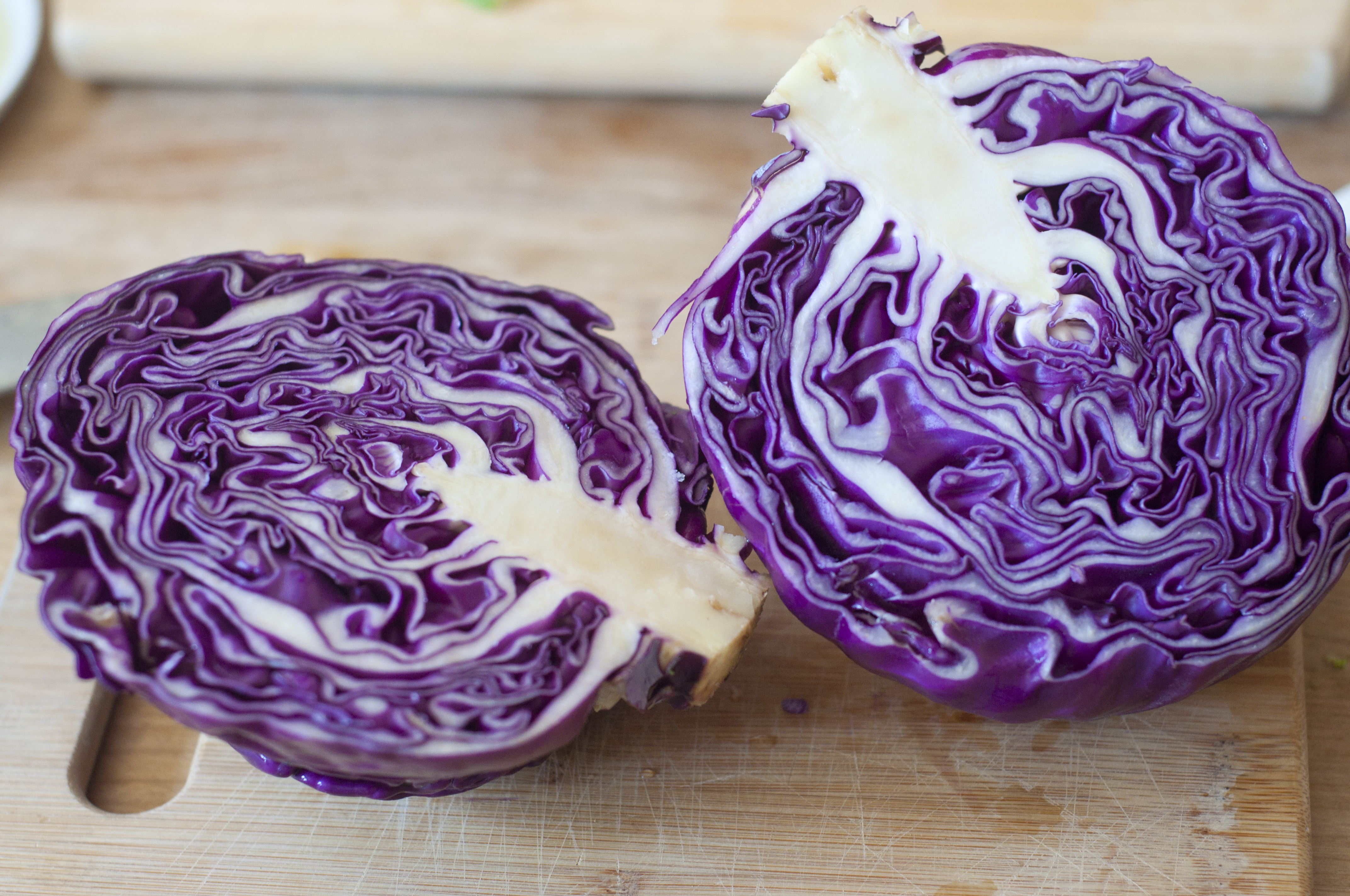 4. While the shrimp are marinating, prepare cabbage slaw. Thinly slice red cabbage.