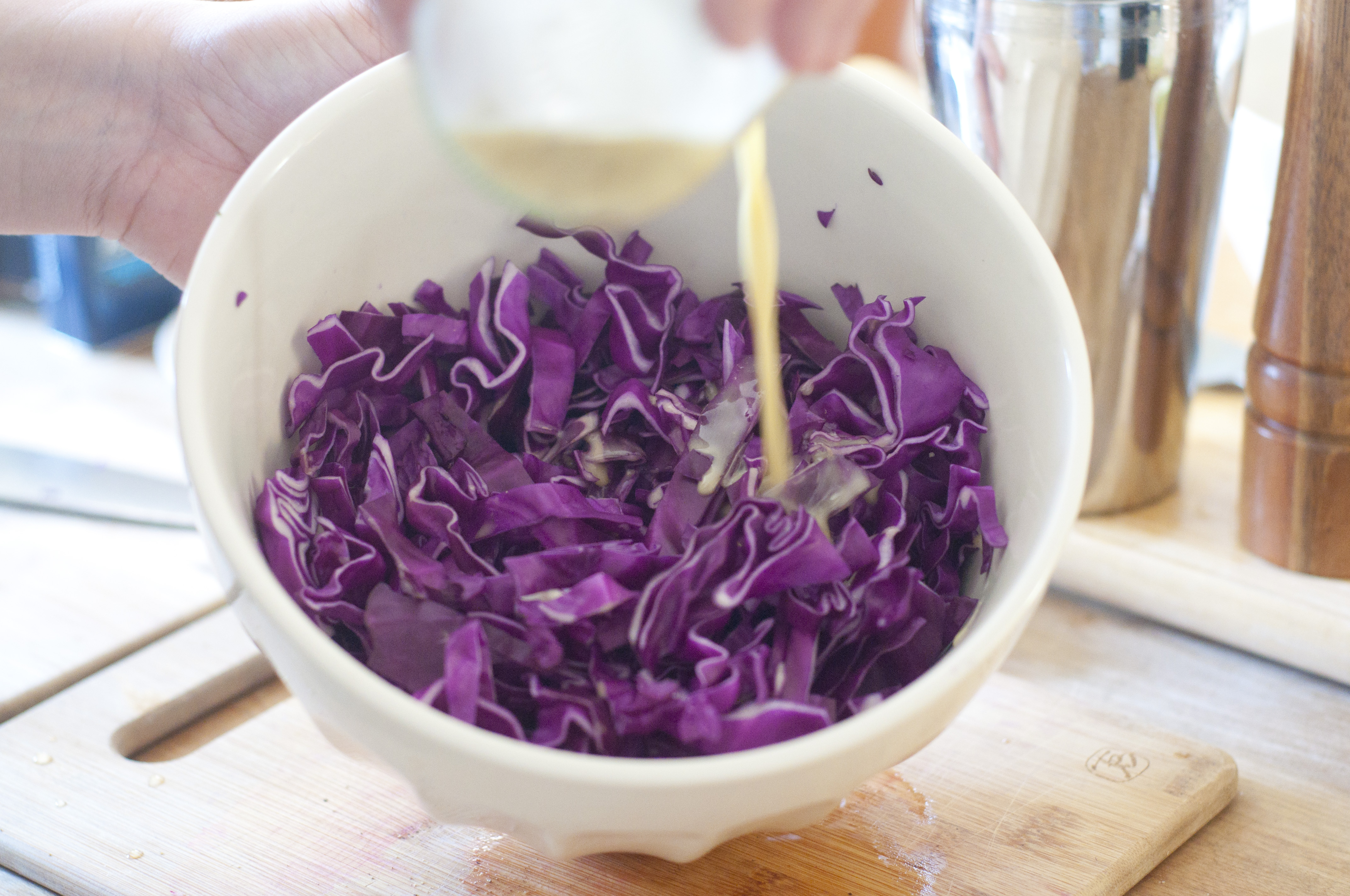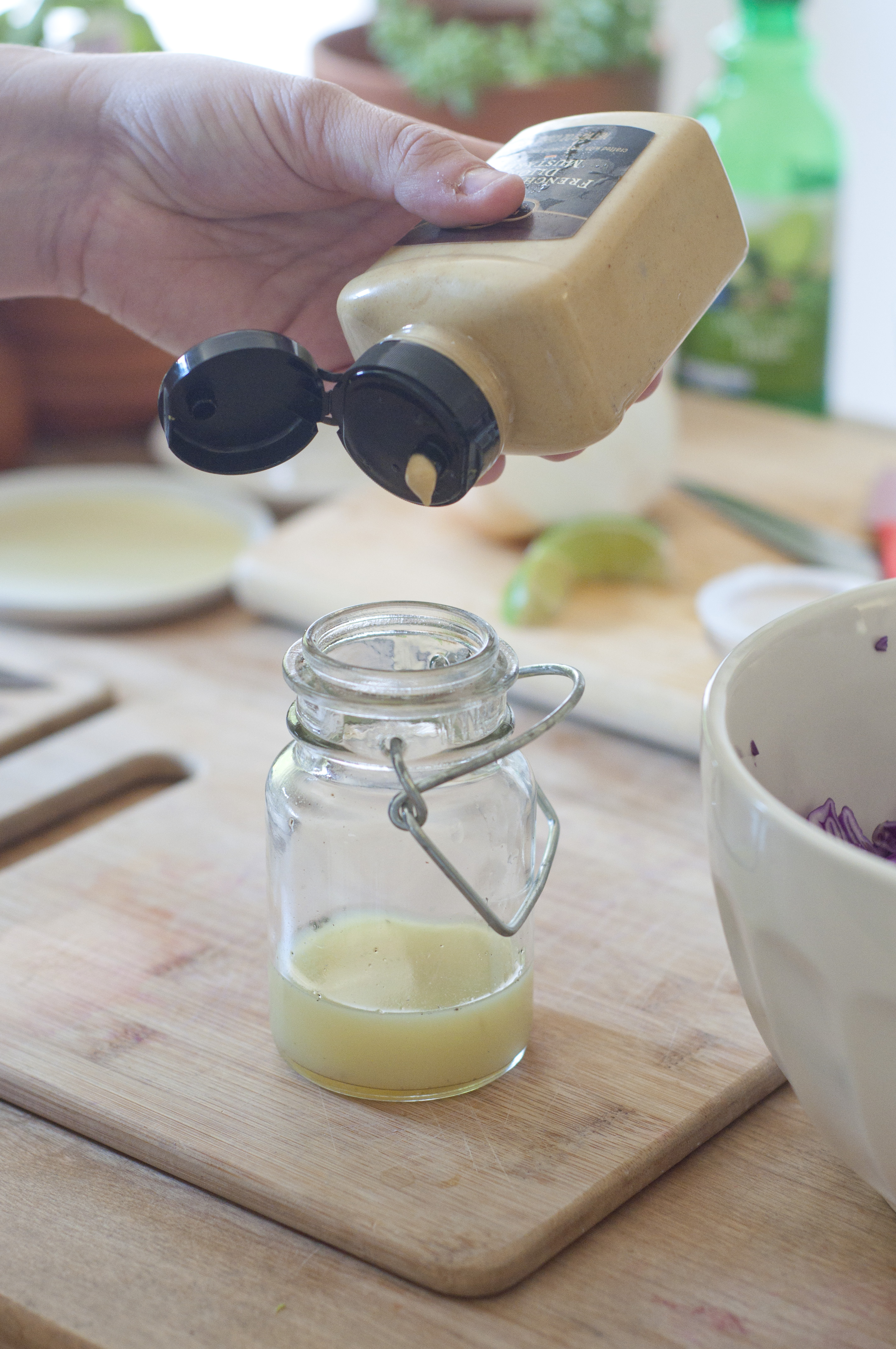 5. Combine lime juice, dijon mustard, oil, salt, and pepper for the slaw dressing. Whisk vigorously.
