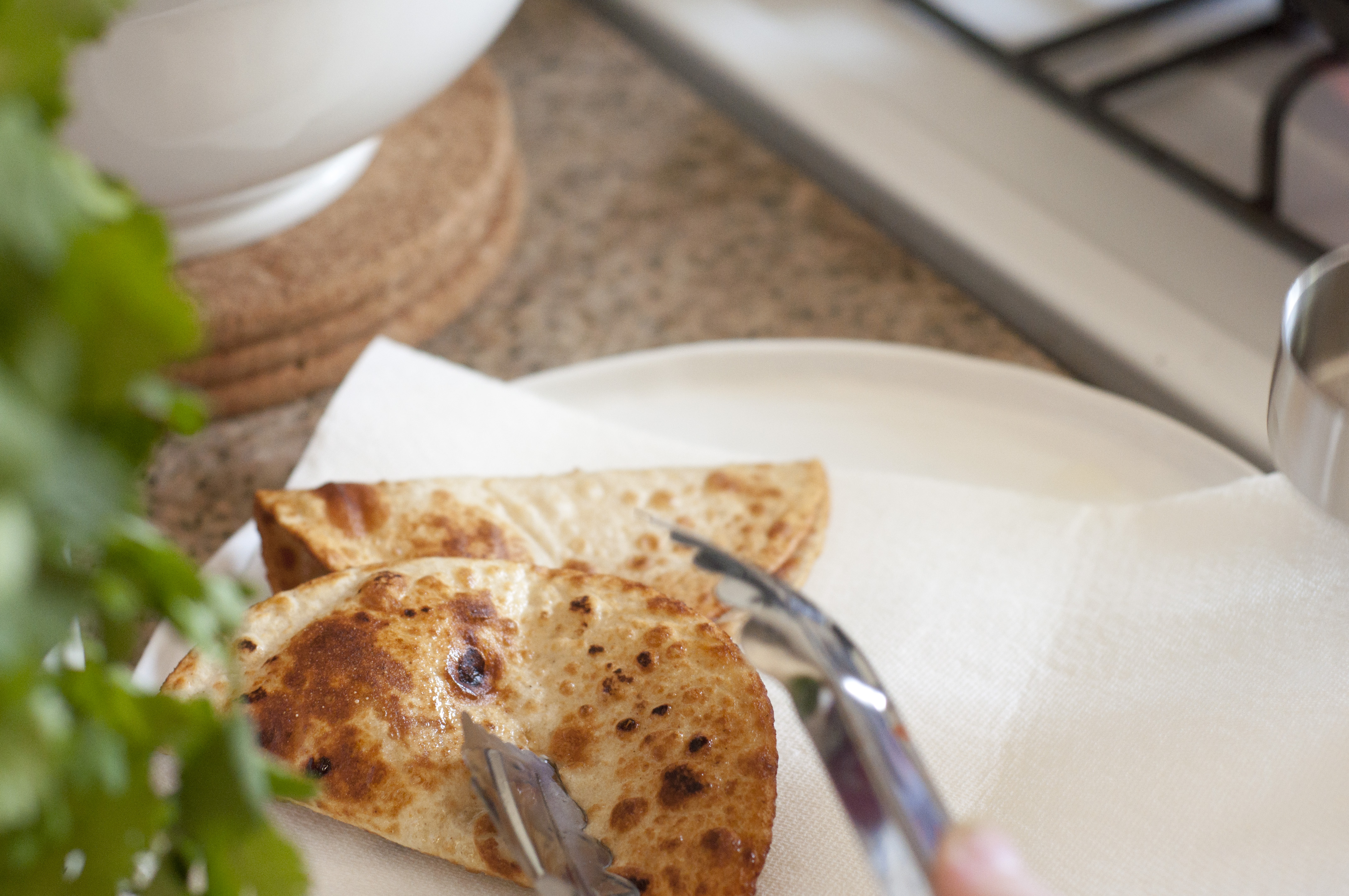9. For crispy tortillas, heat 2 tablespoons of olive oil in another pan over high heat. Cook each side of the tortilla, letting it get a little crispy on each side and then fold onto a napkin on a plate (to absorb any excess oil).